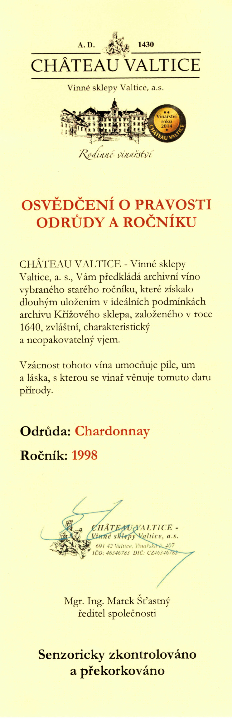 1998 Chardonnay Château Valtice