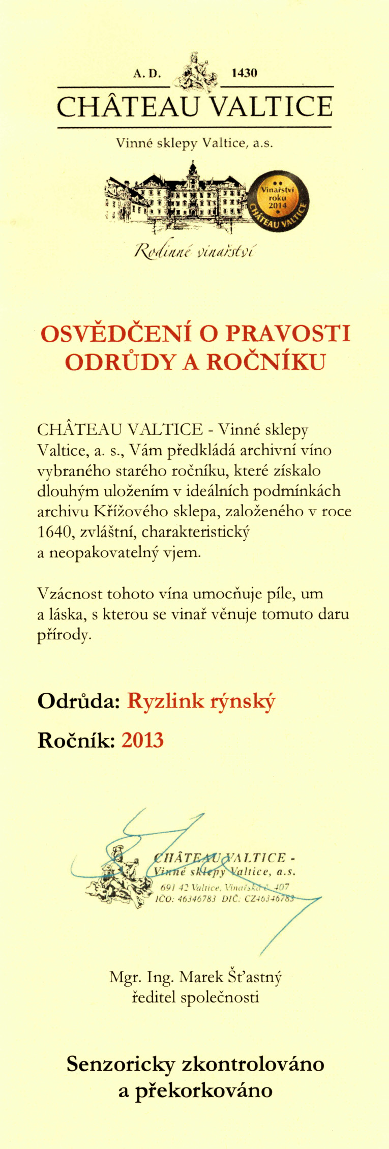 Za profesjonalne przekorkowanie tych win odpowiadają doświadczeni profesjonaliści z Château Valtice. Po jego zakończeniu dołączają do wina certyfikat z informacjami o przekorkowaniu. W związku z tym każdy klient zawsze wie, co działo się z winem.